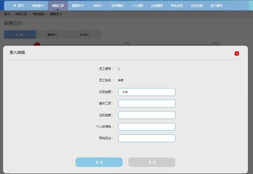 1. 点击“转账汇款-特色服务-薪酬支付”功能菜单,进入薪酬支付页面,系统默认手工录入。